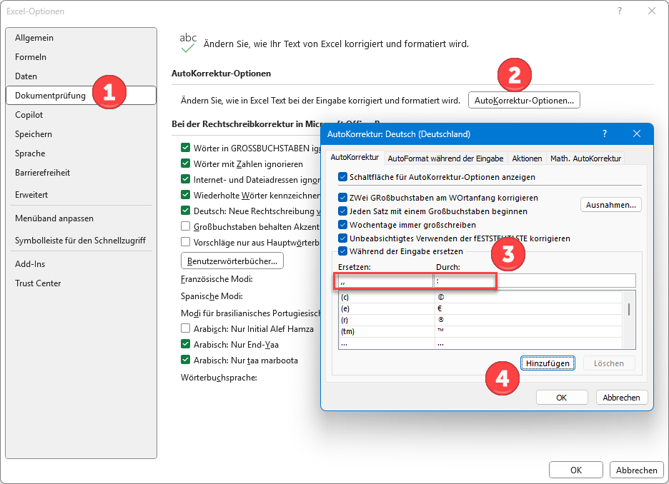 Menü „Datei | Optionen | Dokumentenprüfung | AutoKorrekturOptionen“