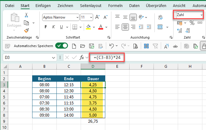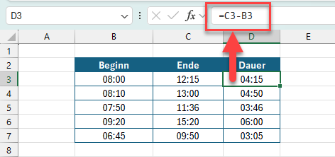 Wie ein Datum ist auch eine Uhrzeit nichts anderes als eine Zahl, die lediglich in einem speziellen Format angezeigt wird. Daher kann man auch über eine ganz normale Subtraktion die Differenz aus zwei Uhrzeiten berechnen: