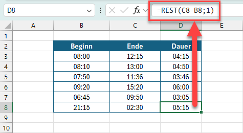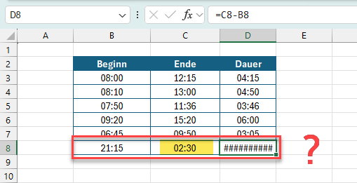 Die Ende-Zeit ist kleiner als die Beginn-Zeit, damit käme bei der Subtraktion ein negativer Wert heraus. Negative Uhrzeiten gibt es aber nicht, zumindest nicht in Excel. Ein relativ einfache Lösung bietet die REST-Funktion: