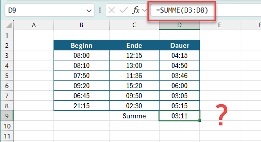 Natürlich lassen sich Zeiten nicht nur subtrahieren, sondern auch addieren. Dabei kann es aber zu einem weiteren Problem kommen. Der Kollege, dessen Stunden in diesem Beispiel summiert wurden, wird sich sicherlich sehr bedanken: