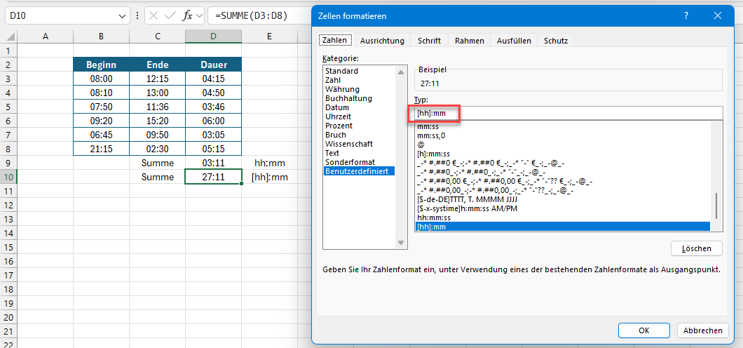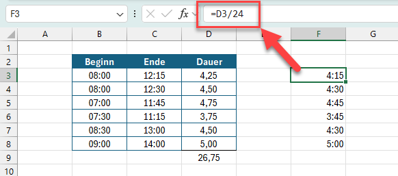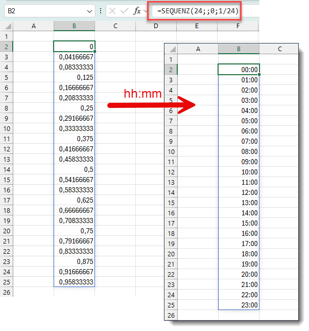 Das erzeugt zunächst eine Liste mit Dezimalzahlen. Mit dem benutzerdefinierten Zahlenformat hh:mm werden daraus aber Zeiten: