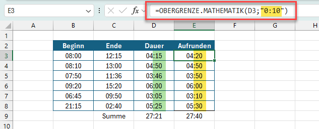 Aufrunden auf die nächsten 10 Minuten sieht dann beispielsweise so aus: