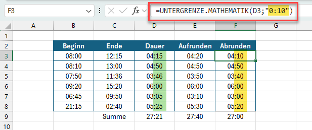 Manchmal geht es nicht so genau und die Zeiten sollen beispielsweise auf volle 10 (oder 15 oder 30) Minuten aufgerundet oder abgerundet werden.