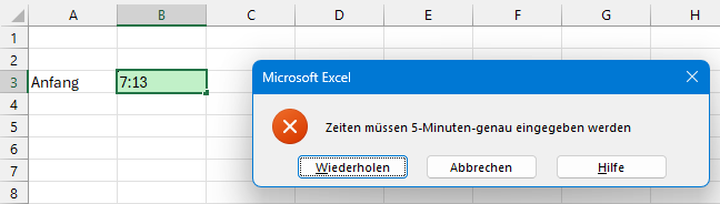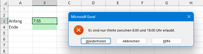 Wer sicherstellen möchte, dass nur Zeiten in einem bestimmten Zeitfenster eingegeben werden, der richtet am besten eine entsprechende Datenüberprüfung ein: