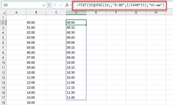 =SEQUENZ(16;;“8:00″;“0:15″)
