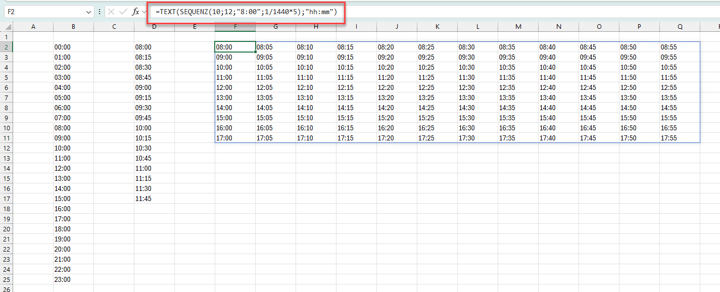 =TEXT(SEQUENZ(10;12;"8:00";1/1440*5);"hh:mm")