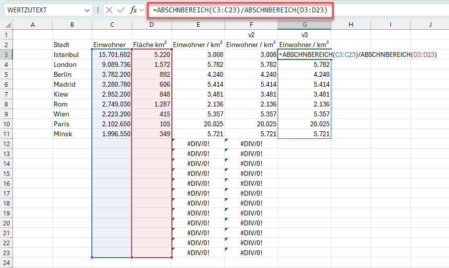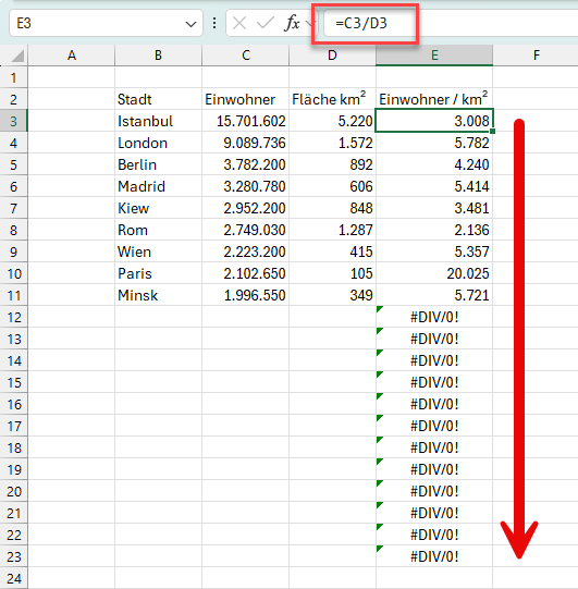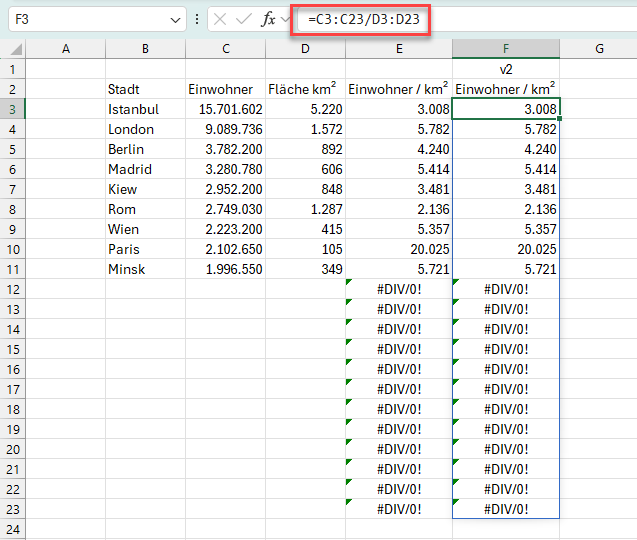 Bevor wir uns diese neue Funktion mit dem sehr sperrigen Namen ansehen, möchte ich nochmal kurz auf die Berechnung der Einwohner/km² in der Beispieldatei eingehen. Bisher steht dort in Spalte E in jeder Zeile eine eigene Formel =C3/D3 (bzw. =C4/D4, =C5/D5 und so weiter).