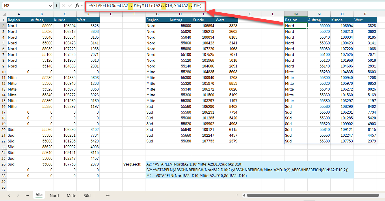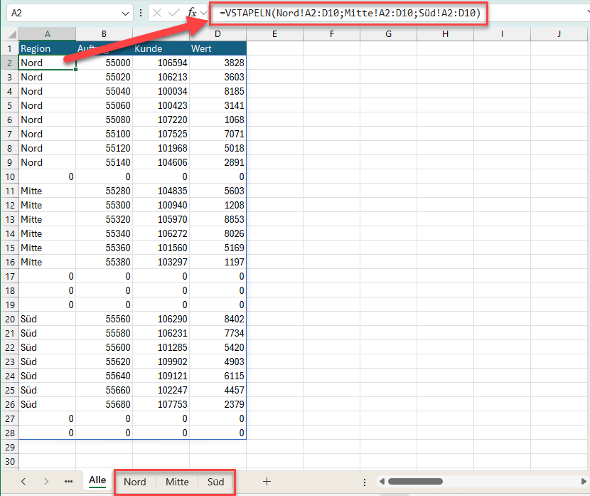 =VSTAPELN(Nord!A2:.D10;Mitte!A2:.D10;Süd!A2:.D10)