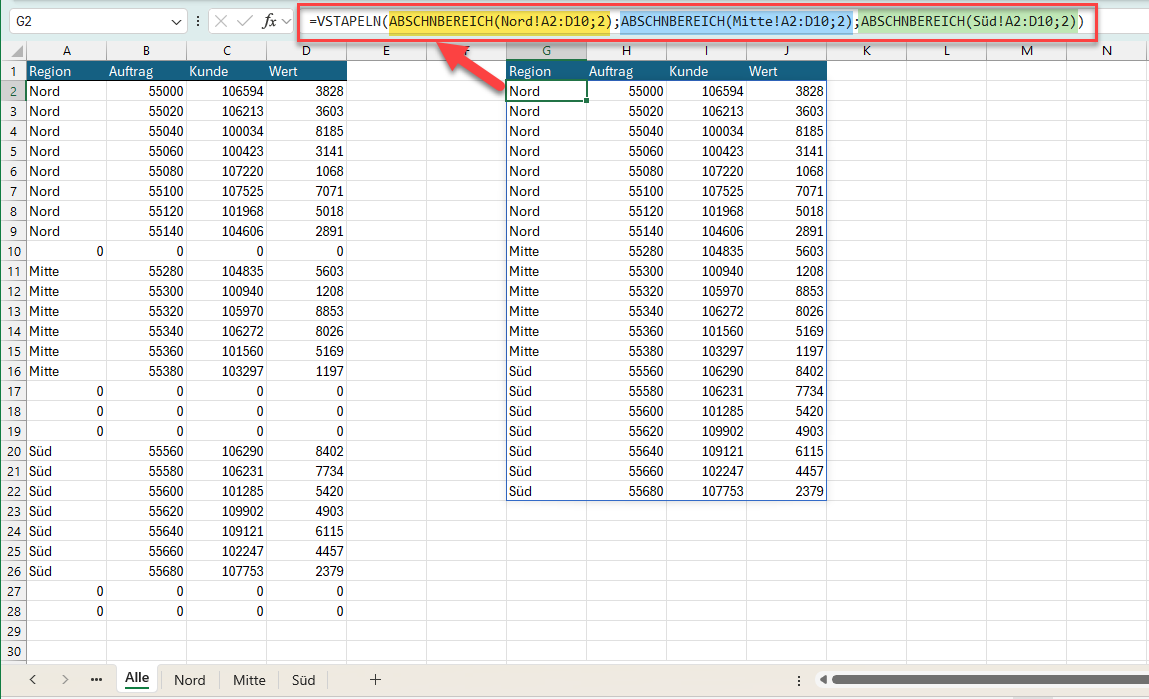 =VSTAPELN(Nord!A2:D10;Mitte!A2:D10;Süd!A2:D10)