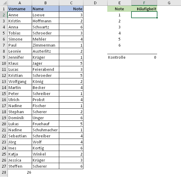 Rechts neben der Notenliste kommt nun in Spalte F die HÄUFIGKEIT-Funktion zum Einsatz: