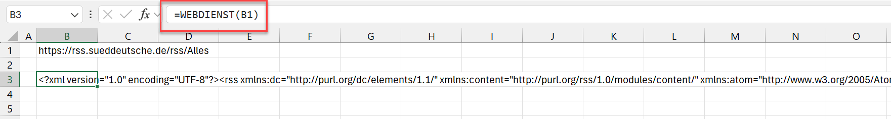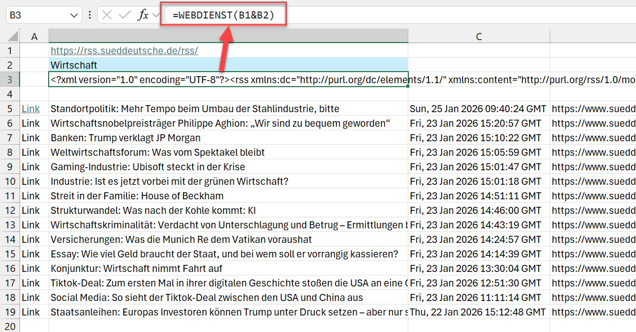 Übergibt man nämlich diese Feed-Adresse an die WEBDIENST-Funktion, erhält man die Daten direkt in einer einzelnen Zelle im Arbeitsblatt: