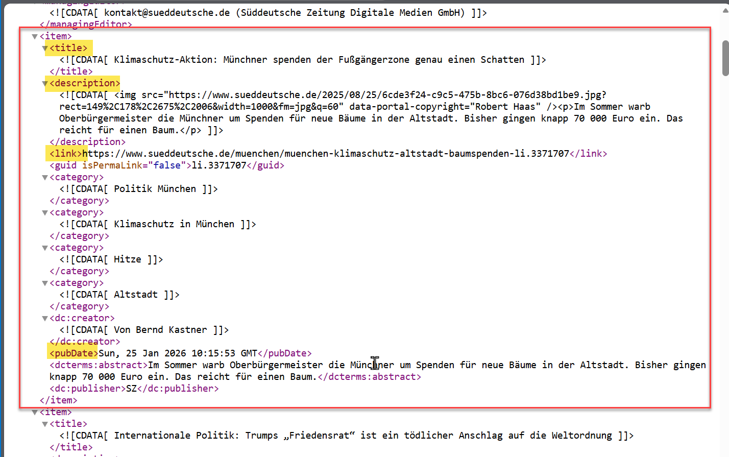 Schauen wir uns das Bild oben mit der XML-Struktur des RSS-Feeds von der SZ mal genauer an. Jeder Nachrichtenbeitrag befindet sich innerhalb eines „items“. Und darunter liegen dann weitere Elemente oder Knoten, wie z.B. „title“, „description“, „link“, „pubDate“ und ein paar weitere.