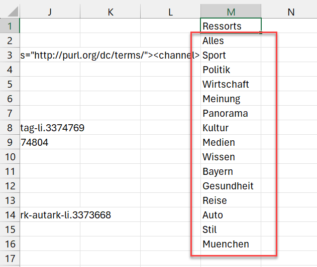 Jetzt wollen wir aber noch etwas mehr Flexibilität und Komfort, was die Nachrichten-Kategorie angeht. Die SZ bietet auf ihrer Website verschiedene Ressorts an, die jeweils auch eigene RSS-Feeds haben. Praktischerweise entspricht der Ressortname fast immer direkt dem letzten Teil der Feed-URL