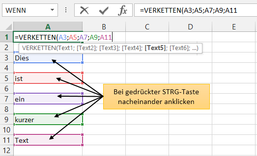 Wer schon einmal in einer Funktion wie z.B. VERKETTEN mehrere Zelladressen eingegeben hat, der weiß, wie umständlich das ist: Zelle anklicken, Semikolon eintippen, nächste Zelle anklicken, Semikolon eintippen usw.