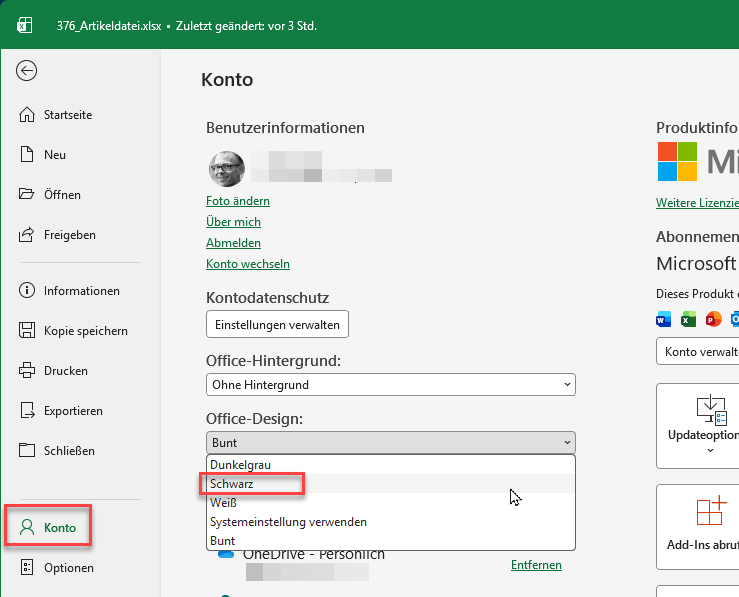 Wie du es vielleicht von deinem Handy kennst, kann man auch Excel in einem dunklen Modus betreiben (ja, Excel steht ohnehin für viele Menschen auf der dunklen Seite der Macht…) Zunächst musst die in den Kontoeinstellungen (Menü „Datei | Konto“) das Office-Design auf „Schwarz“ umstellen: