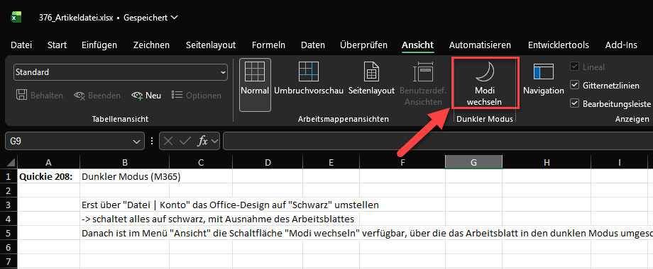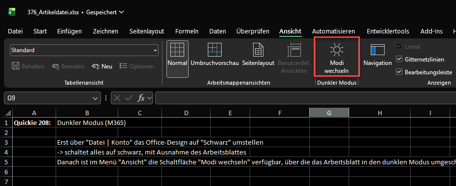 Excel-Quickie Nr. 208: Dunkler Modus in Excel (nur M365)