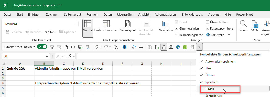 Excel-Quickie Nr. 209: Aktuelle Mappe per E-Mail versenden