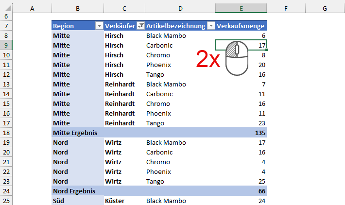Wenn man wissen möchte, was genau sich hinter einer bestimmten Zahl in der Pivot-Tabelle verbirgt (z.B. weil der Chef ganz neugierig nachfragt), lässt sich das mit einem Doppelklick auf die betreffende Zahl schnell herausfinden: