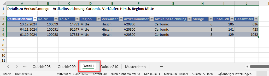 Dadurch wird ein neues Arbeitsblatt angelegt, das genau die Datensätze enthält, die sich hinter der doppelgeklickten Zahl verbergen: