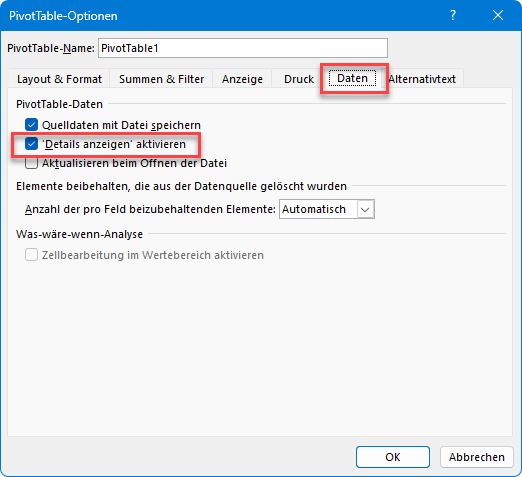 Falls du übrigens diese Drilldown-Funktion abschalten möchtest (weil dein Chef immer zuviel in deinen Pivot-Tabellen herumklickt): Das lässt sich in den PivotTable-Optionen schnell erledigen. Im Registerblatt „Daten“ muss nur bei der Option „‚Details anzeigen‘ aktivieren“ das Häkchen entfernt werden: