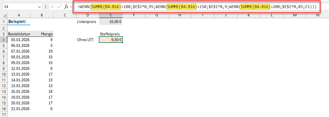 Im ersten Beispiel soll ein Staffelpreis abhängig von der Bestellmenge berechnet werden. Der reguläre Listenpreis steht in Zelle E1 und für den Staffelpreis soll folgende Regel gelten: