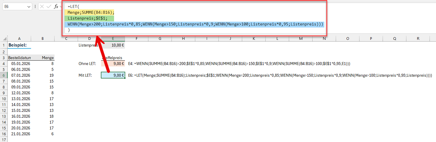 Die eigentliche WENN-Funktion ist vom Aufbau her identisch mit der Variante ohne LET. Der Unterschied jedoch ist, dass darin nur noch auf die zuvor definierten Namen verwiesen wird. Das heißt, die Summenberechnung findet genau ein einziges Mal statt und das Ergebnis wird dann im Namen „Menge“ gespeichert. In der WENN-Funktion wird dann nur noch auf diesen gespeicherten Wert zurückgegriffen.