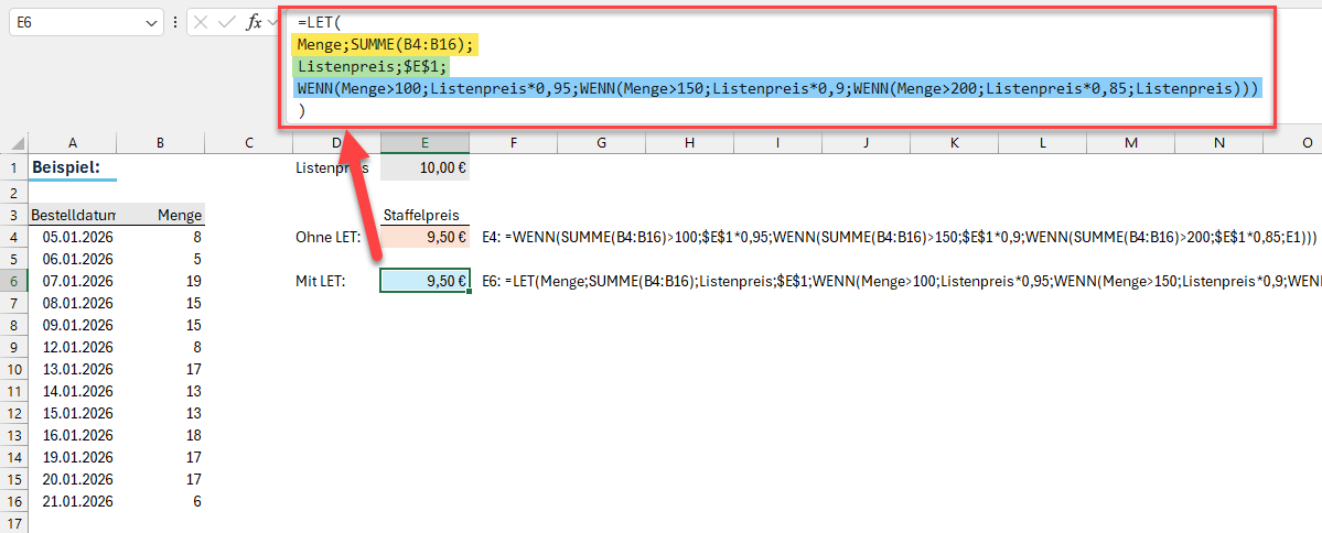 Sollte sich später der Summenbereich erweitern, muss dies in der LET-Formel nur noch ein einer Stelle gemacht werden.