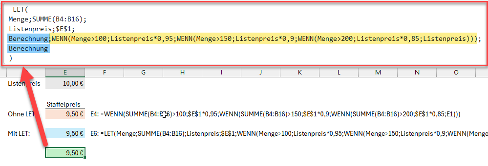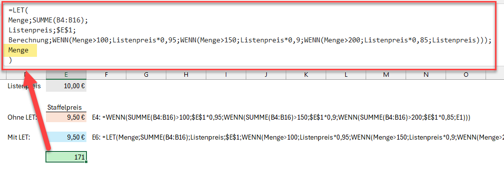 Hier werden zunächst 2 Namen definiert (Menge und Listenpreis) und diesen Namen ein Wert zugeordnet. Im Fall der Menge ist das die Summe über den Bereich B4:B16, für den Listenpreis wird auf Zelle E1 verwiesen.
