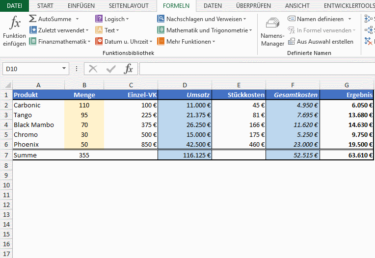 Ich habe eine kleine Tabelle vorbereitet, in der fünf verschiedene Produkte enthalten sind. Da ich sowohl die festgelegten Verkaufspreise als auch die Stückkosten eingetragen habe, kann ich den geplanten Umsätzen die zu erwartenden Kosten gegenüberstellen und mir so automatisch das Ergebnis bzw. den Deckungsbeitrag 1 berechnen lassen: