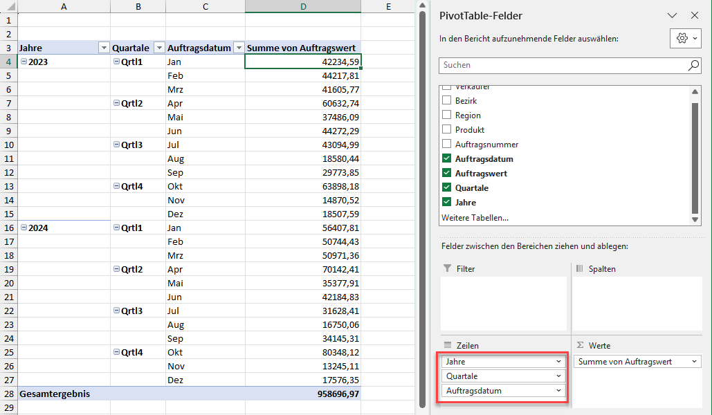 Üblicherweise werden neue Felder für Jahr, Monat und/oder Quartal eingefügt, so dass die Daten bequem auf diesen Datumsebenen verdichtet dargestellt werden können.