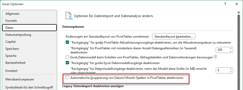 Wen dieses Standardverhalten stört, kann die automatische Gruppierung von Datumsfeldern in den Excel-Optionen auch abschalten:
