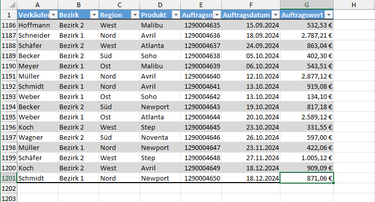 Bleiben wir bei dem Beispiel mit der Auftragsliste. Meine Beispieltabelle enthält je Auftrag einen Datensatz mit diversen Kopfdaten, einschließlich des Auftragswerts.