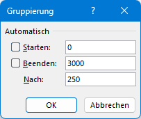 Außerdem schlägt mir Excel eine Gruppierung in 100er-Schritten vor. Diese drei Werte kann ich nun auf meine Vorstellungen hin anpassen. Als Startwerte trage ich 0 ein, als höchsten Wert einen, der etwas über dem vorgeschlagenen Höchstwert liegt. Und im Feld „Nach“ gebe ich eine Klassengröße von 250 ein: