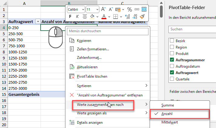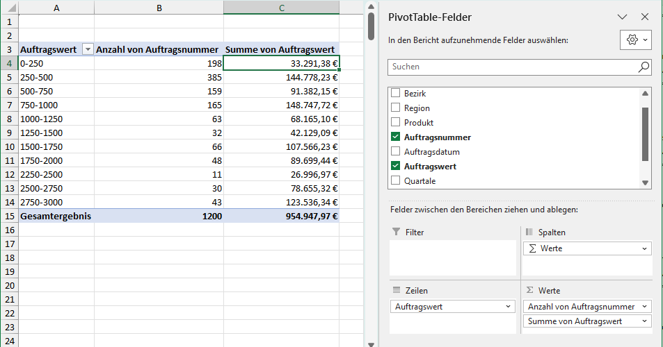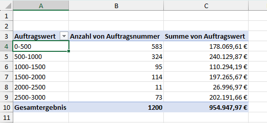 Nach einem Klick auf „OK“ sieht meine Pivot-Tabelle schon deutlich besser aus. Statt der einzelnen individuellen Auftragswerte werden mir jetzt Klassen in 250er-Schritten angezeigt: