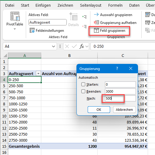 Wenn ich jetzt die Aufträge doch lieber in 500er-Schritten gruppieren möchte, geht das ebenfalls ganz schnell. Einfach die aktive Zelle nochmal auf einen Auftragswert (in Spalte A!) stellen, die Schaltfläche „Feld gruppieren“ klicken und den neuen Schritt-Wert eintragen: