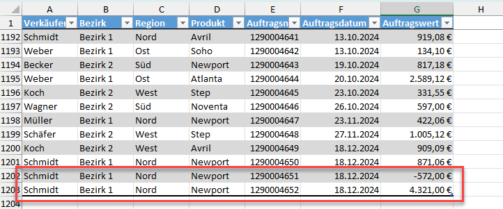 Was passiert nun, wenn in meiner Quelltabelle neue Aufträge dazukommen, deren Auftragswerte über oder unter meinen gesetzten Grenzen von 0 und 3000 Euro liegen (zum Beispiel für eine Retoure mit einem negativen Wert)? Um das zu demonstrieren, habe ich die Auftragstabelle um zwei neue Datensätze ergänzt:
