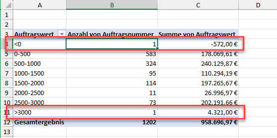 Nun würde ich gerne wissen, wie viele Aufträge einen Wert zwischen 0 – 250 €, 250 – 500 €, 500 – 1000 € usw. haben und wie hoch der Gesamtauftragswert innerhalb dieser Klassen ist. Dazu müssen die Aufträge zu den entsprechenden Klassen verdichtet werden.